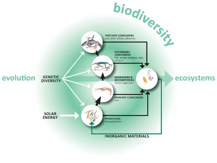 Figure 1.1: Biodiversity is the web of life. This pictorial representation begins on the left with the evolutionary processes giving rise to the genetic diversity of living organisms, showing the organisation of the species carrying genetic diversity into food chains of producers (driven by energy from the sun), consumers and decomposers, and the ecosystems that the organisms make up. The diagram depicts a marine food chain. Redrawn from Biology: An Australian Focus.2