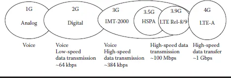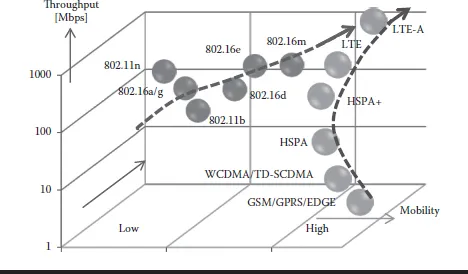 Wireless technology is playing a profound role in networking and communications because it provides two fundamental capabilities: mobility and access. Today’s wireless market winners (shown in Figure 1.3) are medium-capacity mobile broadband networks, including Enhanced Data Rates for GSM Evolution (EDGE), WCDMA, High Speed Packet Access (HSPA), and the LTE of the International Telecommunications Union (ITU) family, wireless local-area networks (WLAN), and Worldwide Interoperability for Microwave Access (WiMAX) of the Institute of Electrical and Electronics Engineers (IEEE) family. Currently, IEEE 802.16-2004/802.16e (Portable and Mobile WiMAX) and 3GPP LTE are two major mobile broadband radio technologies.