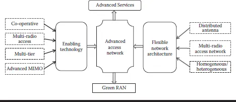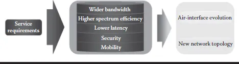 Although LTE has much better performance than its predecessors, ongoing improved service requirements always put challenges ahead of wireless network development. The next-generation network requires lower radio latency, higher spectral efficiency, and more flexible and faster mobility, as well as some kind of cognitive radio that enables optimized spectrum usage over multiple operators. All these requirements need evolution at the air interface and new network topology development, as illustrated in Figure 1.5.