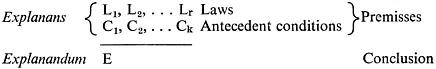 Here, scientific explanation is presented as a form of logical argument. The conclusion of the argument is a statement describing the event which is to be explainedāin this case, the behaviour of a mercury thermometer which is immersed in hot water. This statement is termed āthe explanandum-statementā. The premisses of the argument are of two kinds: statements of general laws, and statements of antecedent conditions. These are termed āthe explanans-statementsā. Thus, schematically: