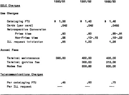The strategy was to relieve libraries of nearly all these expenses and let them experience OCLC use without having to commit funds. At the end of the project, when they were asked whether they would keep or drop OCLC, it was hoped that their decisions would be based on their experiences in the previous two years rather than on any large, past financial investment.