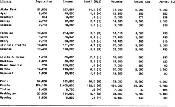Project Libraries. When financial support ended in June of 1982, each participant had to decide whether to maintain the OCLC connection at its own expense. Twelve of the 20 decided to do so. The public libraries in the project ranged considerably in size and circumstances. The largest, the Peoria Public Library, serves a population of 126,000 and has four branches besides its large downtown facility. The smallest, Mason Memorial Library in Buda, serves a rural town of 700. Table II gives a few statistics for these libraries.