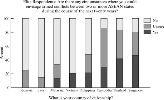 Attempts to compensate for weak regime legitimacy by emphasizing a common threat or enemy have also been relatively common practices in Southeast Asia more generally. For Thailand, it was the Burmese; for Singapore, it was Malaysia and, at times, Indonesia; and for Indonesia, it was either the Chinese or the Federation of Malaysia (Turnbull 2005: 285). However, the consequences of such practices continue to affect the region today. Thus, in the wake of a 2005 territorial dispute between Indonesia and Malaysia concerning the Ambalat offshore oil block, a crowd of Indonesians gathered outside the Malaysian embassy in Jakarta shouting “crush Malaysia” – a catchphrase from President Sukarno’s Konfrontasi policy decades earlier (Emmerson 2005: 175). Such historical animosities – combined with diversity in the cultural, ethnic, religious, and economic spheres – continue to effect regional relations in other respects. In a survey of 100 elites from all ten of the ASEAN nations, 59.8 percent of the respondents indicated that they could not “trust their neighbors to be good neighbors.” Further, when the elite respondents were asked if there were any circumstances where they could envision armed conflict between two or more ASEAN states (Figure 1.1), half the respondents answered “no” but the other half indicated either “yes” (22.3 percent) or that they were “unsure” (26.7 percent). Here it is interesting to note that the “risk of conflict” was perceived as particularly high in Cambodia (29 percent), Thailand (42 percent), and Singapore (47 percent) (Roberts 2007a: 87–88). The limited levels of trust indicated by the elite-level respondents is particularly problematic for the ASEAN proposals as different states will be more hesitant to enter into cooperative arrangements – particularly in relation to key political and security issues – in the absence of adequate trust (Kegley and Raymond 1990: 152).