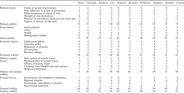 In the case of Myanmar, all of Sorenson’s categories apply; for example, the ruling State Peace and Development Committee (SPDC) has not been able to maintain basic order due to the continuation of armed insurgent groups such as the Shan State Army (South). While other insurgent forces may have entered into a ceasefire accords with the Burmese junta, some of these groups have not disarmed as the United Wa State Army (UWSA), for example, continues to maintain a military force of 21,000 soldiers and much of its revenue comes from the manufacture and export of illicit drugs (Roberts 2010: 67, 83–87). Thus, the government cannot even provide safety from crime and neither is there the rule of law or regime legitimacy. In the case of Thailand, the advent of a military coup in 2006, the revival of the insurgency in Southern Thailand, and the violent anti-government protests in May 2010, inter alia, also provides strong indicators of state weakness. Meanwhile, the Philippines, once a symbol of democracy through its “people power movement,” remains plagued by corruption, failed military coups and long running insurgencies in the South. Not only do the Jane’s Intelligence Stability Indicators (Table 1.1) corroborate the weakness of semi-democratic Thailand and the Philippines, but it remains questionable whether they will be able to significantly consolidate their democracies over the short to mid term because of a continued lack of state capacity.