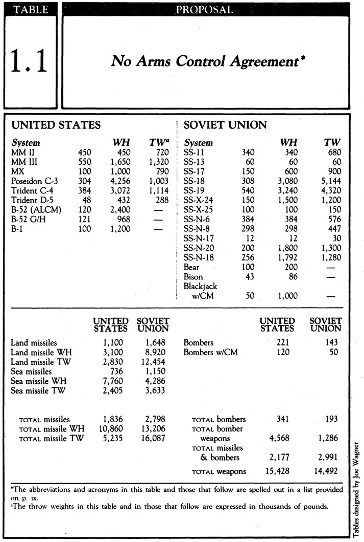 IN THE ABSENCE OF ANY ARMS CONTROL AGREEMENT, the United States and the Soviet Union would be expected to deploy new land- and sea-based missiles, to modernize their bomber forces, and to introduce long-range cruise missiles. The resulting balance would leave each side with about 15,000 strategic nuclear weapons, or about 5,000 more than today (see Table 1.1). The Soviet Union would increase its advantage in missile throw weight. The United States would continue to lead in warheads on sea-launched ballistic missiles (SLBMs) and in bomber weapons. Both the United States and the Soviet Union would have sufficient missile capability to put at risk the other side's land-based missile force, even in a mobile or some other alternative basing mode.2