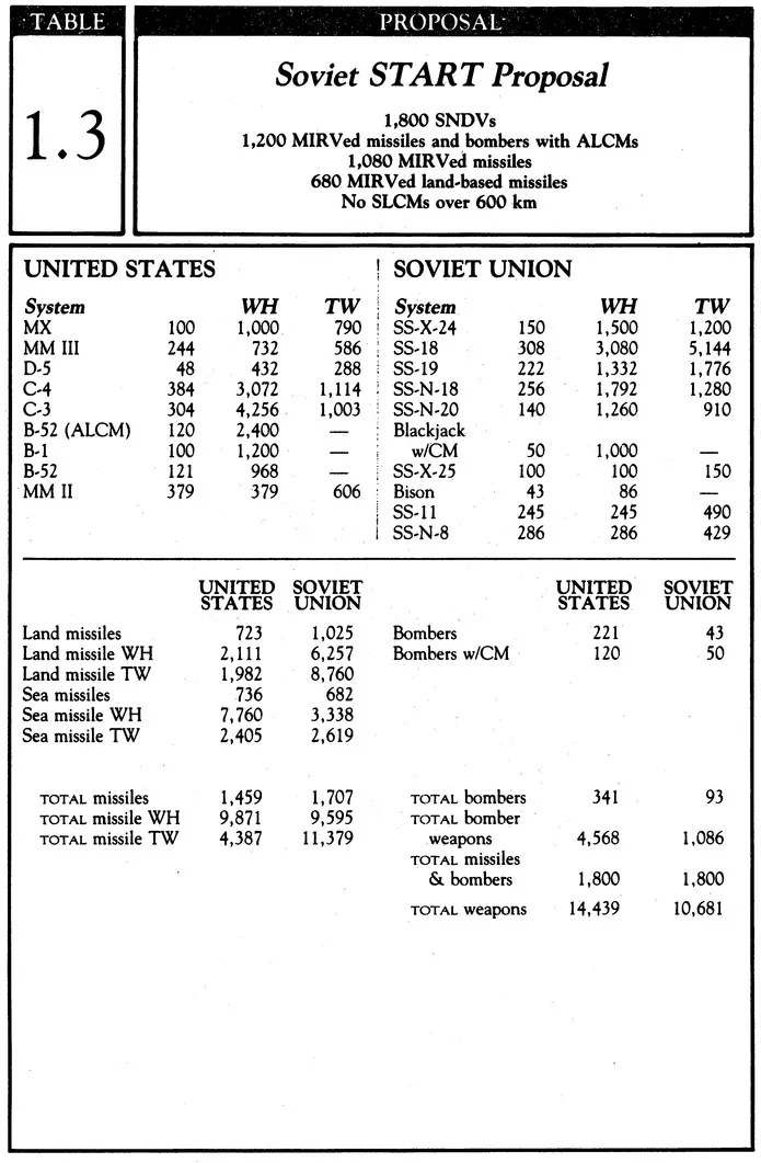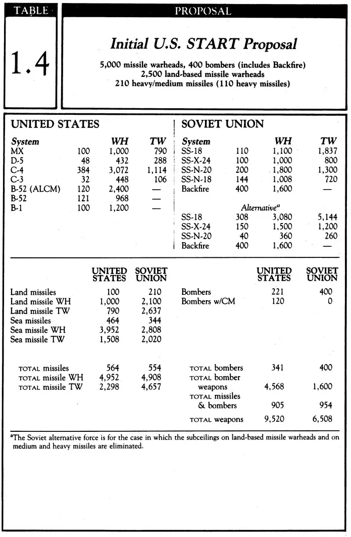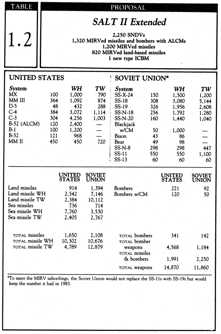 This proposal (see Table 1.4) would enable the United States to deploy the MX missile, the Trident II missile, and the B-1 bomber. The Minuteman II missiles, however, as well as about 800 Minuteman III and Poseidon missiles would have to be retired. Given the planned U.S.