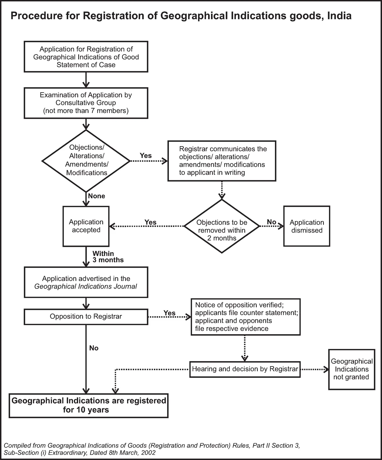 Registry with various queries, doubts and questions. When the questions raised in the report are satisfactorily responded to and removed by the applicant, the report is published in the Geographical Indications Journal. The latter is a bimonthly, bilingual (English and Hindi) statutory publication. This circulation of information in the public domain gives other manufacturers a chance to raise objections and submit them if there is any false claim of the origin or associated attributes of the good to a place. Any person can oppose the application in writing within a specified time period of three months or, if needed, four months. The process of dissemination through this journal ensures that the Geographical Indications label is given to the rightful producers of the good. Considering the chain of checks and verifications, there is no fixed time for the completion of the process of registration; it can vary from a few months as in the case of Chanderi sarees to six years as for the Payyannur Pavithra ring. The initial registration is for a period of ten years, after which the applicant has to apply for a renewal.