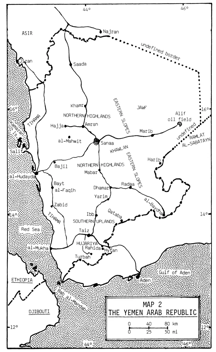 North Yemen, or, more properly, the Yemen Arab Republic (YAR), is located on the margins of the Arab world, on the southwest corner of the Arabian Peninsula, the corner that is formed by the Red Sea and the Gulf of Aden, pointed toward Ethiopia and Djibouti, and separated from the African continent by the narrow Bab al-Mandab Straits. (See Map 1.) It shares this corner of Arabia with South Yemen, the People's Democratic Republic of Yemen (PDRY), which is less to its south than to its southeast and east. The YAR is bounded unambiguously on the west by the waters of the Red Sea and less precisely on the north and northeast by the Kingdom of Saudi Arabia. The YAR's long eastern border with the PDRY and its shorter northeastern one with Saudi Arabia are still undemarcated; the YAR and its two neighbors converge at an uncertain point on the edge of the inhospitable desert known as the al-Rub al-Khali, the Empty Quarter. Dwarfed by Saudi Arabia, which is eleven times its size, the YAR occupies a tiny portion of the land mass of the Arabian Peninsula. Although its exact size is made uncertain by undemarcated borders, it is roughly the size of the state of Nebraska or South Dakota. In this small area reside, according to the 1986 census, approximately nine million people, a bit fewer than in Ohio but more than in Michigan. The YAR's population is larger than that of the Kingdom of Saudi Arabia and slightly more than half the total for the entire peninsula. Its number of people may be four times that of the PDRY, even though the YAR has less than two-thirds the area of this neighbor. Together, the two Yemens contain a clear majority of the total population of the Arabian Peninsula.
