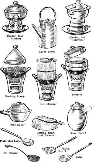 An oil strainer is used to drain off the oil for deep-frying. It is made from wire strings with a bamboo handle. A special kind of wooden rice steamer with a movable bamboo bottom is used to steamed rice in the South-west Provinces of China. For smoking, a certain kind of frame is used. The charing dish and sandy-pot are served on the table.