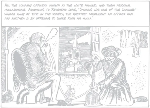 These are the minor characters in history, with no agency and who bow to the inevitability of history, but the graphic novel takes them and by forcing us to pay attention to them causes us to take a fresh look at history. Take a panel like the one on page 9 of Banerjeeâs tale. It is a full-width panel showing an Englishman seated on a toilet puffing away at a hookah while gazing at the spire of a church outside. At his foot crouches an Indian servant working the mechanical contraption of the hookah. The text reads:
