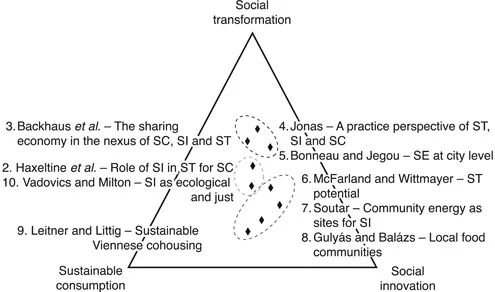 Figure 1.1 Positioning of chapter contributions in relation to the nexus of social innovation, sustainable consumption and societal transformation.