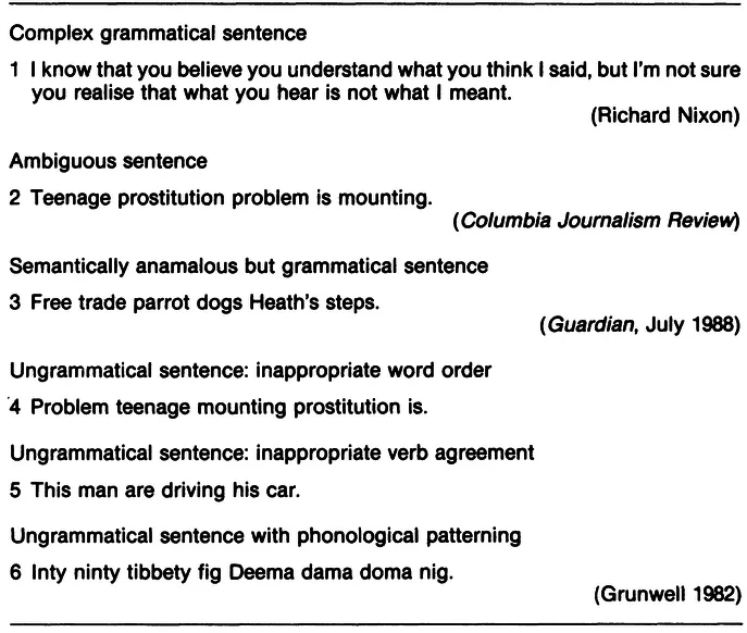 Perhaps the most important and challenging aspect of grammatical knowledge is that it facilitates productivity; that is to say, given the finite number of discrete sounds which occur in any language, a speaker who knows the grammar of the language can produce and understand an infinite range of novel but grammatically correct and meaningful sentences. Grammatical knowledge makes it possible to discriminate well-formed from ungrammatical sentences, even when such sentences are unnaturally convoluted, and to recognise ambiguous and semantically anomalous sentences (see Figure 1.1).