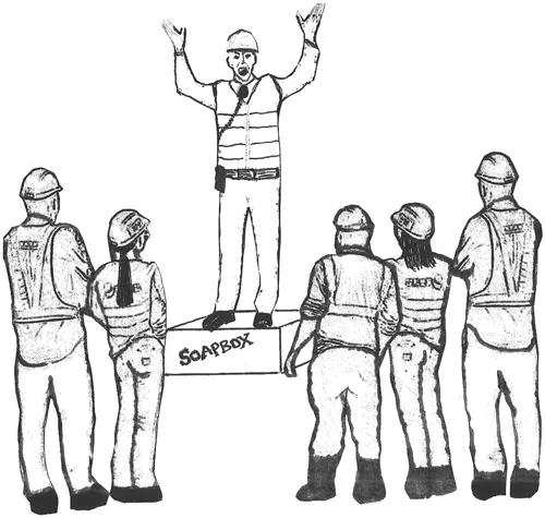 Aircraft damage prevention was the primary focus of the safety initiative. Repairing an aircraft struck by a motorized vehicle was expensive. In addition to direct costs associated with the repair, there were delay costs. A delayed flight had a domino effect. One flight delayed impacted subsequent flights later in the day. Passengers had to be rebooked or overnighted if another flight was not possible. The brand also took a hit. Frequent flier surveys always listed on-time arrival as very important, not to mention the safety implications of flying a damaged aircraft. If an aircraft was damaged and it resulted in a delayed flight, and it almost always did, all hell rained down from above. I called it “Soapbox Safety.” At the supervisor’s shift briefing the next day, the boss mounted the soapbox and preached, berated, cussed and fumed about our lack of diligence and care working around aircraft. As a young supervisor, I followed suit. I went back to my area, got on my soapbox and preached and yelled and cussed. It started somewhere around the top and worked its way down. I learned how to manage safety from their example (Figure 2.1).