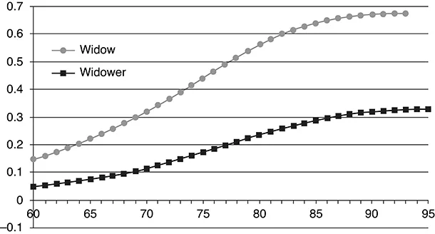 The high proportion of the widowed older population has attracted the attention of researchers in this field. Because of longer life expectancy and lower birth rates in China, the proportion of the older population is expanding, and so is the widowed population. In Hong Kong, the proportion of older widowed adults was reported to be about 31.0%, reaching 292,219, of which 16.4% (47,901) were men and 83.6% (244,318) were women (Hong Kong Government, 2011). The growth rate of the total widowed population from 2006 to 2011 was about 7.6%, a little higher than that of the period 2001â2006 by 0.4%. Yet, both were much higher than the average annual rate of increase in the number of older persons corresponding to the time, which was 2.0% and 2.5%, respectively. In Mainland China, people who are aged 60 or above are officially referred to as the older group. According to the Ministry of Civil Affairs of the Peopleâs Republic of China (2017), there are approximately 150.03 million older people aged 65 or over in Mainland China, comprising 10.8% of the total population by the end of 2016. In the trend of rapid population aging, a large number of elders will experience spousal bereavement in the coming decades. In 2010, about 26.89% of older people aged 60 or above, nearly 4.75 million, were in a state of spousal bereavement (Population Census Office under the State Council, 2012). Among the older widowed population, their cumulative spousal bereavement probability increases with age according to Jiang, Li, and SĂĄnchez-Barricarte (2015) (see Figure 1.1). When a man reaches age 60, his spousal bereavement probability approaches 0.05. In other words, his spouse has a mortality risk of 0.05 before he reaches 60. By contrast, for a woman, this likelihood leaps to 0.15. In the coming decades, the number of aging people will rise increasingly quickly. Wang and Ge (2013) predicted that the total widowed older population would reach 118.40 million by 2050, of which 23.91 million would be men and 94.49 million women.