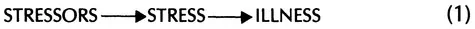 A simplifed schema of the relationship we have been discussing may be depicted as follows: This schema outlines a stress pattern that can potentially identify risk factors for the incidence or exacerbation of illness and provide clues about the most effective way to change the situation (by removing the stressor, by lowering the stress, or by treating the illness directly). For example, let us suppose an executive is experiencing a continuing stressor such as constant job pressure. At this point we could say that he is demonstrating a stress response that, according to the model of the GAS, would be in the stage of resistance. Let us suppose that now an additional stressor occurs, such as exposure to a viral pathogen. Because our executive is already resisting one stressor, he may well experience sensitization to the second stressor and succumb to illness more readily than if he were not reacting to a stressor already. Of course, even without an added stressor our executive might fall ill simply from the effects of continued pressure from the original stressor. His means of tolerating that stress may well impair his day-to-day functioning over time and lead to a peptic ulcer, for example.