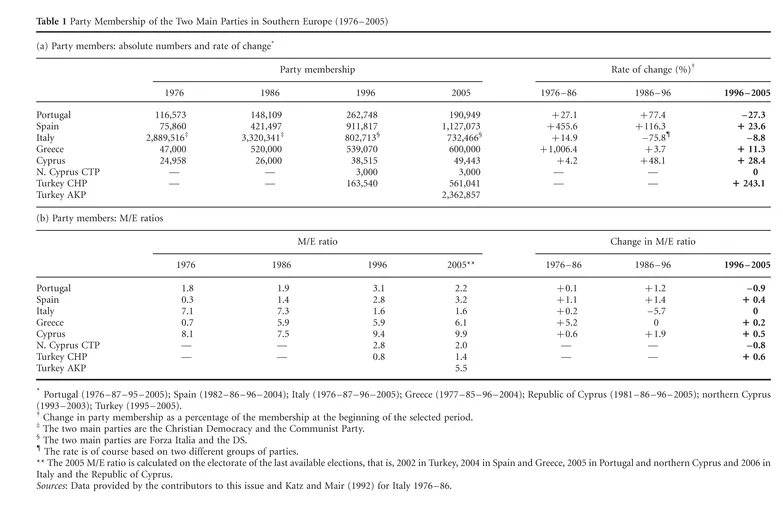 Table 1 presents the total number of members of the two main parties in each South European country over the 1976-2005 period and reports the same data as a percentage of the overall electorate (M/E or rate of organization), a measure that makes it possible to compare party memberships across nations and over time. The table also illustrates membership variation in each of the last three decades.