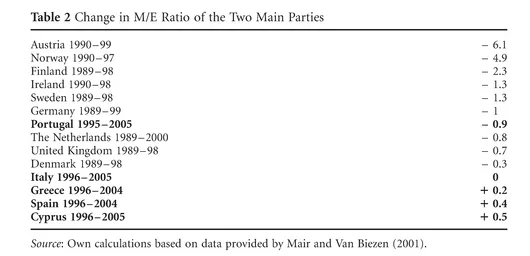 Such a picture of stability and growth with minor patches of decline is confirmed when we shift from raw numbers to the analysis of the rate of organization. The last column of Table 1(b) clearly shows that between 1996 and 2005 most of the party memberships not only kept pace with the growth of the electorate, but in four cases (Spain, Greece, the Republic of Cyprus and Turkey) even managed to grow at a higher rate than the national electorates. Only in Portugal and northern Cyprus is the M/E ratio negative, while in Italy the decrease in party affiliation was matched by that in the overall electorate, resulting in a zero rate. Therefore, a first conclusion that can be drawn from these data is that in Southern Europe there is no party membership decline as in the rest of Europe. In the 1996-2005 decade such a decline was limited to two countries, while even Italy seems to have stopped the haemorrhage of members that had characterized the general crisis of the early 1990s. Actually, if we compare the changes in the M/E ratio registered by the two main parties in a number of European polities between 1990 and 2000 with those recorded in Southern Europe, we identify different tendencies (Table 2).