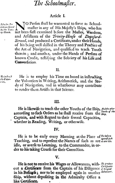 The sea going teacher seems to have escaped further official attention for almost 30 years for there is no official mention of the post until the issue of the first Regulations and Instructions relating to his Majesties Service at Sea issued in 1731. These directions were one of a series of reforms introduced between 1727 and 1733 that included improvements in seaman’s pay, overhaul of charities and the foundation of a naval academy in Portsmouth dockyard. More specifically the Regulations sought to bring commanding officers, particularly those of ships in distant waters, under close administrative and financial control and were probably an attempt by the Admiralty and its Deputy Secretary, Thomas Corbett, to see that captains did their job properly.19 To this end all members of the ship’s hierarchy, the lieutenant, the master, the purser, the chaplain and so on, had their duties identified and laid down in a series of articles. The duties of the schoolmaster, and by this