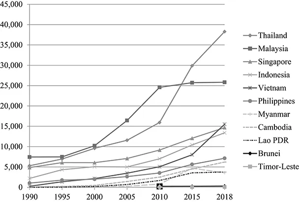 Figure 1.1 International tourist arrivals in Southeast Asia (1990–2018) (in thousands)