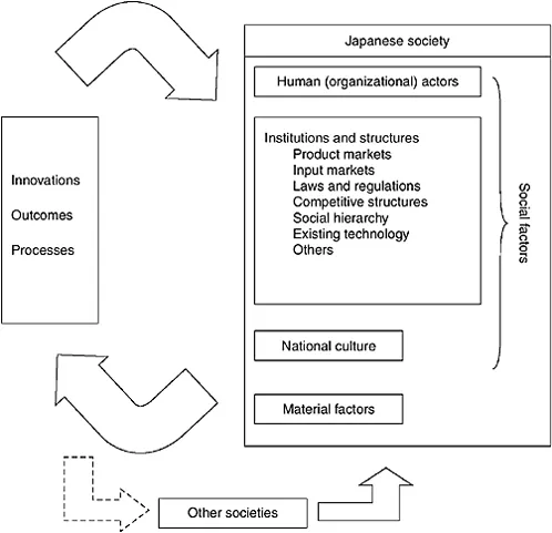Furthermore, the editors would like to provide a general framework for analysis in this book, which consciously follows the perspective of the SST. First, the factors constituting society and innovations in society constantly shape each other. This book focuses on the relationships between the Japanese society and innovation. Second, the factors constituting society include individual and organizational actors, each of which has a specific worldview, interests, and intentions, and eventually acts based on them. Third, the social factors also include institutional and structural factors such as output markets, input markets, laws and regulations, industrial structures, social hierarchies, and existing technology. They restrict interactions between individual and organizational actors. Fourth, national culture is also included in the social factors. National culture more latently but persistently affects the interaction between actors and the construction of institutional and structural factors. Fifth, the human society consists not only of these social factors but also of material factors. The actions of actors are always accompanied by material things. Institutional, structural, and cultural factors are also supported by things. Therefore, we should pay attention to the material constraints as well. Sixth, there are other societies in the world. We should not ignore the influence of other societies on the society we are focusing on: in this book, the influence of foreign or international societies on the Japanese society will also be considered. Seventh, the influences of innovations might transcend national boundaries. For example, the Japanese model of the production system, the so-called lean production, has diffused worldwide. Although the relationships between different societies and innovations in different societies are reciprocal, this book focuses only on a part of the complex relationships.
