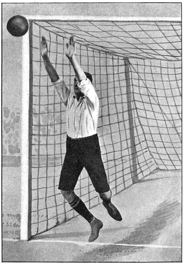 Punch-ball exercises are some of the best he can practise, and nearly all clubs have a ball fitted up in their training room. He ought to also practise place kicking, and endeavour to do so with both feet. I have often seen a goal scored simply through a poor return by the goalkeeper. Many allow one of the backs to take the goal kicks, but this is a big mistake, as it entails extra work on him, and he probably has as much to do as he can get through. I always like to see the ball thrown or kicked to the wings instead of the centre, where the play is generally concentrated. It is a mistake to attempt to punch a ball when it is wet and greasy and there is plenty of time to give it a lusty kick. Many a match has been won and lost through the goalkeeper attempting the former. The inauguration of the penalty kick has made the position more difficult than in the olden days. Critics say that eleven goals should be scored out of twelve. This is all very well in theory, but in practice it is another matter. It is, however, from both points of view a most trying time in any game, especially when the result of the match depends upon whether a goal is scored or saved. I shall never forget last year at Chelsea, when in the closing moments of the game Notts County were allowed a penalty, from which they scored.