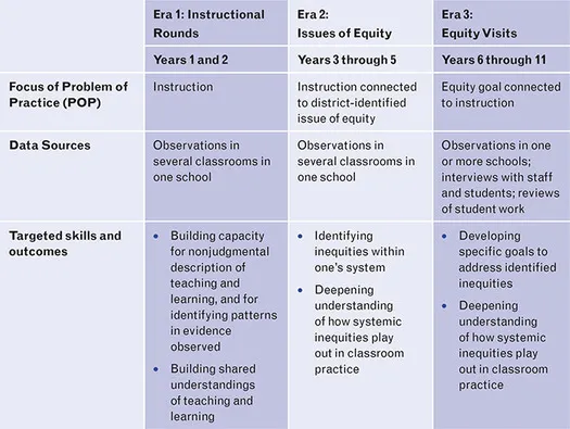 We describe NJNSâs shift to the use of equity visits in three âeras.â Throughout the three eras, NJNS regularly visited schools in participating superintendentsâ districts and observed a range of problems of practice related to instruction and equity. While the design team and participating superintendents were deeply committed to equity in education, our ongoing reflection on NJNSâs activities made it clear that the practice of instructional rounds was not supporting the types of conversations needed for instructional improvement for all students, particularly students of color and other underserved students. These reflections prompted the changes from one era to the next. For each era, Figure 1.1 highlights changes in the focus of the visits, the types of data collected, and learning objectives for the participants.