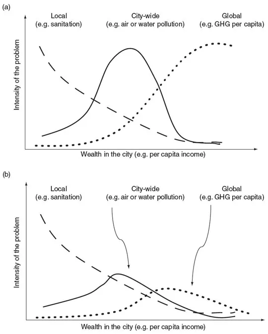 The relationship between development and pollution is often described using the so-called environmental Kuznets curve, shown in Figure 1.1a. It describes a general pattern that pollution increases as countries develop, until such time that they are rich enough to afford to invest in cleaner technologies and change the course of this pollution curve in the opposite direction. However, this is not uniform across all types of pollution. In particular, the contribution to global environmental problems, such as climate change, keeps increasing with rising incomes. Presently, many countries face the challenge of reducing those emissions. Some developing countries have rapidly urbanized and industrialized in the last decades following similar paths of environmental degradation. Some of these cities are among the most polluted in the world and increasing their contributions in terms of GHG emissions.