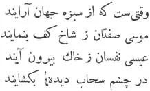 ![]() | (b) The jocund spring doth now the world delight, And hearts attuned yearn for the country bright. Each bough parades the sheen of Moses’ hand The breath of Christ is felt in zephyrs slight. |
