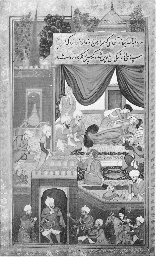 1. Young Babur dangerously ill in Samarkand. A physician sprinkling his face with water.