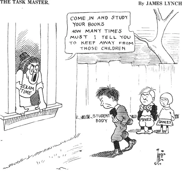 In their own discourse, college students readily acknowledged the importance of peer-oriented social activities like fraternities, sororities, dating, and cinema over academic pursuits controlled by the older generation (see Figure 1.1). On January 10, 1923, the student-run New York University Daily News (Lynch, 1923) published a cartoon entitled ‘The Task Master,’ in which a wiry-haired boy labeled ‘Student Body’ trudges reluctantly away from two other children – a little girl tagged ‘Dances’ and another boy identified as ‘Movies’ – toward an open window, where ‘Exam Time,’ an older woman with glasses, a severe pompadour, and a strident pose, barks: ‘Come in and study your books. How many times must I tell you to keep away from those children?’ In this configuration, cinema and dances represented welcome distractions from the work of college life (exams). Importantly, both movies and dances are depicted as of the same generation as the ‘Student Body.’ Both leisure activities are represented as youthful peers as opposed to the overbearing ‘Exam Time’ who hails from another age. ‘The Task Master’ thus depicted college as a series of diversions meant for the young, while exams were a form of drudgery required by adults.