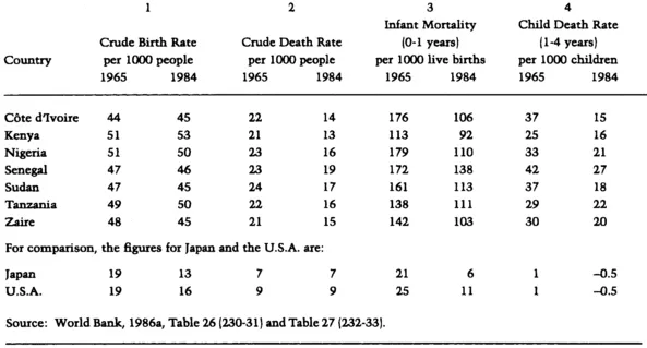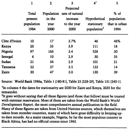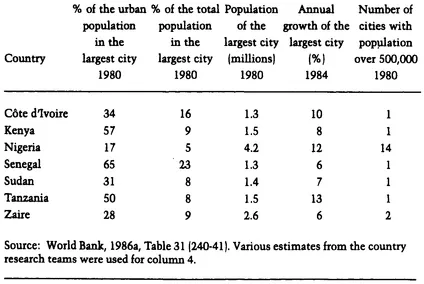 For sub-Saharan Africa, the two key demographic events of the period 1950 to 198s are steady population growth and increasing urbanization (see Tables 1.1 and 1.2). Although the region is not highly urbanized by global standards, the trend in that direction has been extremely rapid. Also notable is that, in conformity with world trends, the largest cities have generally been growing fastest. In this case, one would expect the largest city within the national urban hierarchy to become increasingly dominant. Table 1.3 shows the degree of dominance of the major cities in 1980 - the latest date for which comparable data were available.