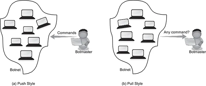 Figure 1.1 Botnet communication styles: (a) Push style (b) Pull style.
