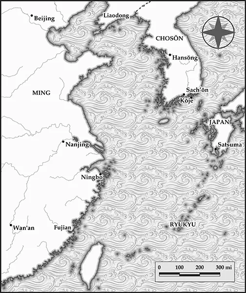 Xu Yihou appears to have been a native of Wan’an county in Jiangxi province (Map 1.1) and from a humble background.3 In his report, Xu introduces himself by explaining that he and everyone on board his boat were captured by Japanese pirates twenty years earlier, off the coast of Guangdong province. Like many others from the coastal regions, Xu bitterly remarks, he was taken as a slave to Japan.4 Owing to his knowledge of medicine, however, he won the favour of the lord of Satsuma, Shimazu Yoshihisa 島津義久 (1533–1611) (whose family erected the stele shown in Figure 1.1). It is from this position that he not only gained access to militarily sensitive information, but – according to his own account, at least – with tearful pleading had been able to convince Hideyoshi to order action against the marauding pirates when he accompanied Yoshihisa to an audience with him.5 Xu’s preoccupation with pirate abductions suggests he was genuinely taken to Japan forcibly, rather than merely making such a claim in order to avoid being accused of breaching the ban on travel abroad, which made him automatically suspect simply for being in Japan.6