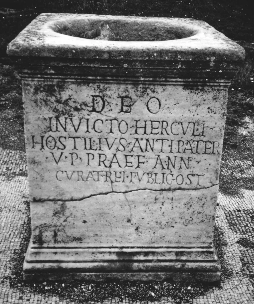 The two late Republican temples were to have a long history. By the later second century ce, they were still standing, virtually unchanged, but their direct environment had been completely transformed (Figure 1.2; Mar 1990, 153–159). While a number of smaller structures had begun to appear around the east end of the sacred area over the course of the first century, the Trajanic period saw the construction of several large multistorey complexes between the temples and the old castrum. Later, one of these buildings was transformed into a bath complex, so that the smaller of the two temples was surrounded by a caldarium on one side, and a water wheel for lifting groundwater on the other. Within a few decades, the temple area became almost completely detached from the urban environment. While the large temple had previously dominated the extramural zone, it had now become visually marginalized, and even though the sanctuary remained accessible from the Via della Foce, the paved square in front of the temples now was situated on a significantly lower level than the street, which had been raised by about a metre in the late first century ce. Still, the temples continued to be used and maintained until the end of Ostia’s ancient life cycle (cf. Boin 2013, 181–182). Upon excavation, in the 1930s, inscriptions and statuary from the first century bce were found alongside inscriptions dating to the late third and fourth century ce, and restorations of the fifth century ce: in the large temple, the late Republican duumvir Cartilius Poplicola continued to be commemorated throughout the imperial period—his statue (Figure 1.3; AE 1941, 99) was found alongside an altar to Hercules dedicated by Hostilius Antipater, curator rei publicae Ostiensium under Diocletian (Figure 1.4; AE 1941, 65; cf. AE 1971, 66). Even if the inscription referring to a restoration under Theodosius and Arcadius (AE 1941, 66; Boin 2010, 258), once associated with the temple, is probably unrelated to it, traces of building activity have been dated to the fifth century ce; in late antiquity, the place had basically become a monument to Ostia’s long urban history (Boin 2010, 264).