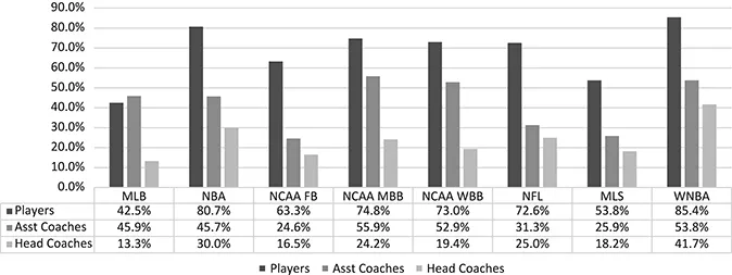 The sport world tells a different story, though the ending is the same. In Figure 1.1, I show the representation of players, assistant coaches, and head coaches across various North American leagues. With the exception of Major League Baseball, the proportion of racial minorities players far outpaces that of racial minority assistant coaches or head coaches. Among National Collegiate Athletic Association (NCAA) womenās basketball programs, racial minorities are nearly 4 times more likely to be players than they are to serve as a head coach. This pattern, which is evident among most professional and collegiate sport leagues, signals that racial minorities have opportunities on the court or field, but not in leadership roles. The trend persists despite the fact that most coaches were former players (Cunningham & Sagas, 2002), and players represent the most viable pool of potential assistant coaches (Everhart & Chelladurai, 1998).
