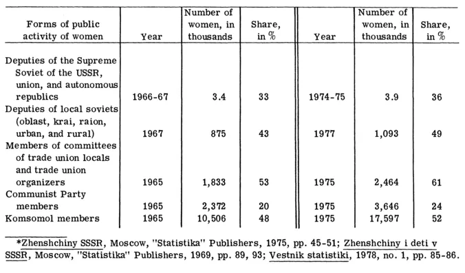 First of all, it is being carried out under conditions of greater labor participation by women. Thus the proportion of women workers and employees is 51% of all workers at state-owned enterprises. The proportion of women among those working on collective farms is 48%. Today more than 62 million women are employed in the national economy. More than 40 million of them participate in the socialist emulation movement, including 25 million who take part in the communist work movement. Lately women's councils have become more active, special committees for work among women have been set up in the country's legislative bodies, and women are playing a greater part in government management and administration and in the party and trade unions (see Table 1).
