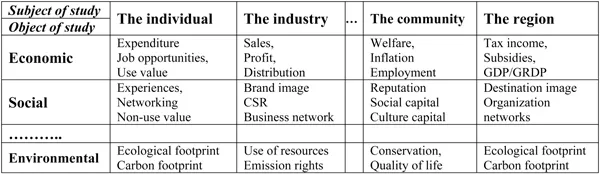 For a long time, the object of study has been strongly focused on the expenditure by event visitors and the economic impact, often limited to the direct economic impact but sometimes also including indirect impacts. There is however now a growing body of literature with a focus on the social impacts as the object of study and, following the strong trend of research about sustainability, environmental impacts of events are expected to become an object of study rapidly growing in importance. This large variety in terms of objects of study requires a wide spectrum of theoretical competence. Whereas a well-made economic impact study is based on knowledge of economic inputâoutput analysis and general equilibrium theory, social impact studies require a psychological and/or a sociological academic background. Environmental impact studies will need a thorough understanding of natural science and environmental economics.
