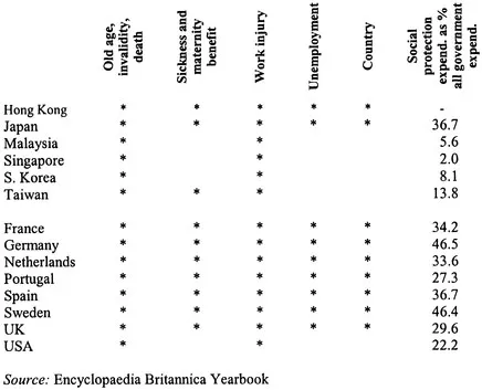 Whereas from the perspective of the west these economies have sometimes been thought of as examples of rampant capitalism they do not match Esping-Andersen's liberal type in that they are characterised by high levels of central direction and low levels of individual rights (Jones, 1993). The absence of any developed sense of individual rights or equity also rules out a social democratic model, with the nearest model appearing to be the conservative-corporatist. But, such comparisons miss the fundamental point: the Esping-Andersen typology is based on historical resolutions in Europe that have no direct parallels in the very different historical circumstances of south and east Asia (Kwon, 1997). A specific difference is that, unlike European corporatism - that particularly underlay the Bismarkian social programmes in Germany - social policies in the Asian industrialised economies have generally not been introduced against a background of threats from the working class (Kwon, 1997). Rather they can be viewed as a reflection of the perception of what has been necessary in order to ensure economic growth. The political strategy, in other words, was driven, pragmatically, by considerations of what policies, with respect to welfare, were deemed most appropriate for achieving increased national prosperity. This was carried out against the background, in many Asian countries, of Confucianism in which it is the group - the family, the firm and the nation - which takes precedence over the interests of the individual. Such systems are highly structured such that duty is owed upwards and responsibility down, the family is the basic building block of a grand, national corporation which is characterised by authoritarianism, the incorporation and neutralising of opposition, and subservience to the needs of the whole with the result that welfare policy 'has been more strongly shaped by the developmental priorities of politically insulated states than by extra-bureaucratic political forces' (Deyo, 1992, p.304). In general this has meant that the decommodification of welfare has not been greatly pursued so that social expenditures have been restricted in order that the 'primary goal of national policy' (Ku, 1995, p.360) would not be starved of the necessary resources.
