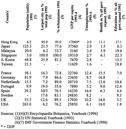 The aim of this chapter is to assist the understanding of developments in the individual elements - service sectors - of welfare policy, discussed in subsequent chapters. This is achieved, in part, by the presentation of brief, historical accounts of the broad characteristics and evolution of welfare policies in the two countries. These accounts are themselves devices that, through specific example, identify the location of Britain and Malaysia in wider frameworks encompassing all industrialised countries - both east and west. The first of these frameworks - the concept of welfare regimes starts from the assumption that industrialised countries can be classified according to the particular type of welfare model they have developed. As an approach, it is one that emphasises difference rather than similarity and emphasises the dynamics of the political, the ideological and the cultural in shaping difference. The second framework, in contrast, emphasises the process of globalisation in establishing conditions that are common across countries and may be thought of, though not necessarily so, as leading to some convergence, or greater similarity, of welfare systems.