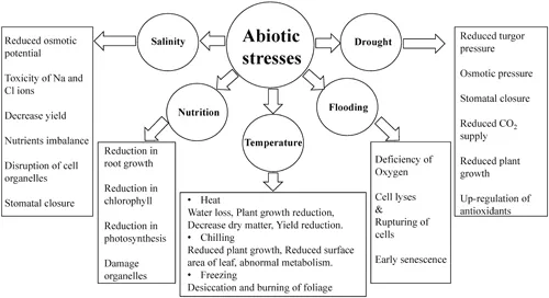 FIGURE 1.1 Effect of different abiotic stresses (salinity, nutrition, temperature, flooding and drought) on plant.