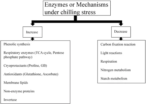 FIGURE 1.2 Enzymes and mechanisms which increase or decrease under chilling stress.