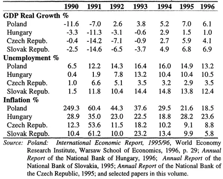Economic progress is evaluated most often through an analysis of changes in real Gross Domestic Product, inflation and the unemployment rate. While these data do not tell the whole story and may in fact be biased to some degree, the information we have summarized in Table 1.1 below gives an unrefined baseline of comparison for our selected group of transitioning countries. It is important to stress that the data are greatly influenced by the different initial economic conditions, the progress of legislative changes that were so necessary in setting the ground rules, and the variety of programs and methods used in each country in setting up a market structure.