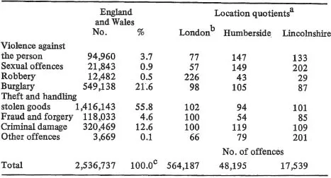 Table 1.1 gives the breakdown of serious offences for England and Wales in 1979. The predominance of property offences is abundantly clear – over 95 per cent of the total. In terms of numbers, offences against the person are much rarer (about 5 per cent). In order to highlight right away some of the considerable variation which exists in the incidence of different types of offending, location quotients are calculated for three contrasting police authorities. The Metropolitan Police is by far the largest police force in Britain — some 22 per cent of serious crime in England and Wales occurs within its jurisdiction. Robbery is the offence which is relatively most prevalent in London. Sexual offences and violence are well below the national proportion.