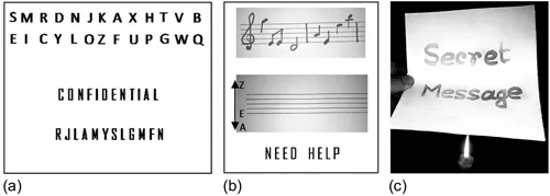 FIGURE 1.1 Example of early information hiding techniques: (a) Vatsyayanaâs cipher-based data hiding; (b) use of musical notation to hide information; (c) use of lemon juice as invisible ink.