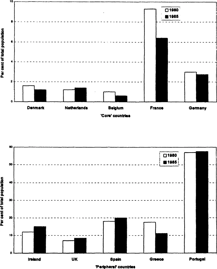 Commencing with the familiar, Figure 1 presents now quite old Eurostat data on the incidence of poverty in Europe in the first half of the 1980s. The measure of poverty used is based on income and, being set at 40 per cent of the European Community average, is severe. The diagram reveals that at that time poverty was much lower in the geographical and economic core of Europe and falling, and higher and rising in the peripheral areas. (The reasons for this pattern fall beyond the scope of this chapter but possibly reflect the restructuring inherent in the increasing economic integration of Europe (Cross 1993).)