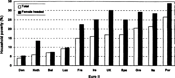 Figure 2, which unfortunately excludes Germany takes an expenditure based measure for 1988 with poverty thresholds set at 50 per cent of national household expenditure. Despite the difference in definitions,[1] the statistics show broadly the same geographical pattern. Moreover, as can be seen from Figure 2, the incidence of poverty was noticeably higher among women than among men, especially in the European periphery.