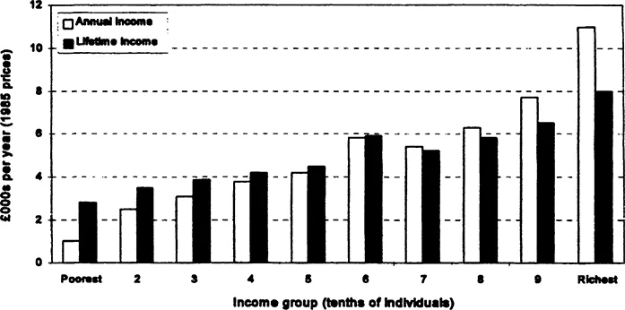 An example of this phenomenon comes from Britain and contrasts annual incomes with life time incomes based on a dynamic simulation model (Falkingham and Hills 1995). Consistent with theory, Figure 3 reveals that income measured over the life-time is much more egalitarian than annual income; indeed depending on the measure used, inequality is reduced by between a third and a half. Employing precisely the same data, and fixing an individual poverty line at 50 per cent of median income, causes the poverty rate to be approximately halved.