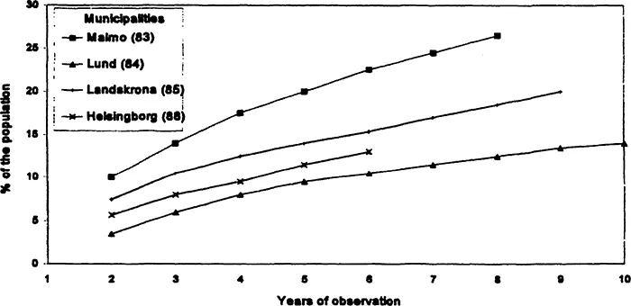 Prevalence, therefore, has value as an analytic concept as well as a descriptive one and this can be illustrated with Swedish data on social assistance receipt Figure 4 arrays the numbers of people recorded as ever having received social assistance in four Swedish municipalities when the observation period is expanded from one to nine years. It shows that, depending on die locality, between four and ten per cent of people of working age make a claim for social assistance in any particular year, which is consistent with the widely accepted view that poverty in Sweden is comparatively rare and that social assistance fulfils a largely residual function. However, the fact that anywhere between 14 per cent and 28 per cent of the working age population will make a successful claim on social assistance in the longer term acts as an important corrective to the initial assumption. Moreover, it is evident that while the proportion claiming benefit is lower in Lund than in Malmo, people tend to receive benefit for a longer time (the slope of the curve is flatter).
