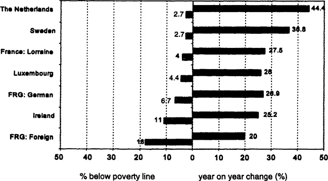 However, the reality is often very different as is indicated by the graph presented in Figure 5. This compares poverty rates for selected European during the late 1980s and early 1990s, with the threshold set at 50 per cent of median national equivalised income. But, more important in the current context, the graph also records t...