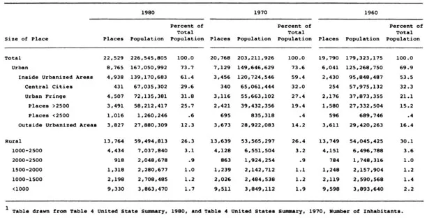 The number of places has increased by about 2,700 since 1960, with the bulk of the change occurring between 1970 and 1980. Almost all of these absolute increases affected places in urban areas. As the upper panel of Table 1 indicates, regardless of whether inside or outside of urbanized areas, there has been a monotonie increase in the number of places in each size category. The fastest growth occurred in the urban fringe, especially among places >2,500, and in central cities (70% increase between 1960 and 1980). In 1980, almost three of every four individuals resided in an urban designated area and more than six of every ten resided inside an urbanized area. During the same period the small urban communities (<2,500) and those outside the urbanized area accounted for a decreasing